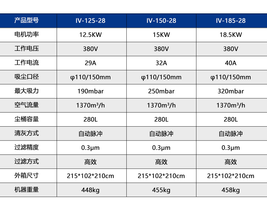 IV-125-28一款脉冲自动清理工业级吸尘器,采用高负压涡轮风机提供动力,三相异步电机更能胜任工业环境中的长时间工作。该设备是一款移动式工业吸尘器,可与钻床、CNC加工中心、铣床等多种工业生产设备配套使用,配有旋风分离装置和脉冲振尘功能,可清理生产设备加工时产生的较多粉尘和颗粒物。也可以应用于五金、喷塑、家具、陶瓷、化工染料、橡胶、矿产、轮船、飞机制造等打磨灰尘的收集和各种机械设备配套使用。
